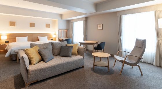 ご宿泊は2023年にリニューアル誕生した客室「オーセントスイート」は、北の大地で成長した北海道産木材を活用しました。