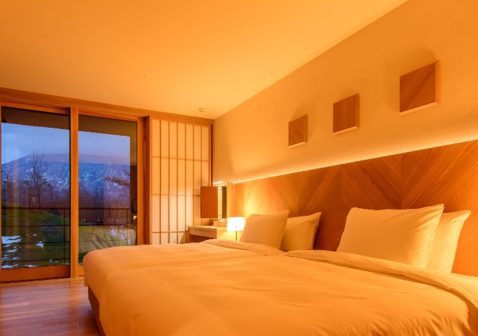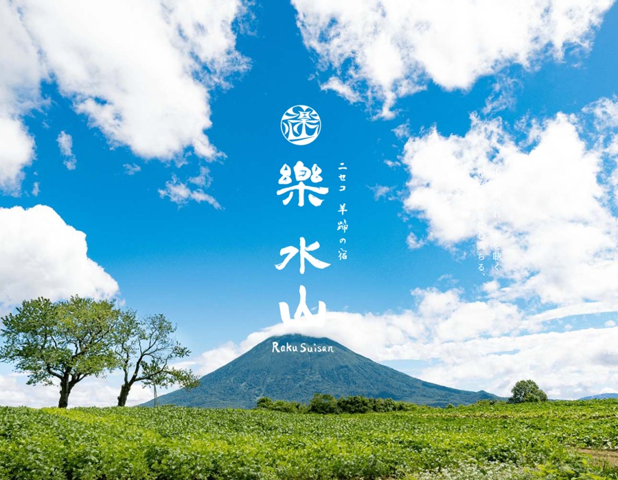 ニセコの静寂の中に佇む「楽水山」へ。 全室に備えられた源泉かけ流しの露天風呂からは、 雄大な羊蹄山の姿を眺めることができます。