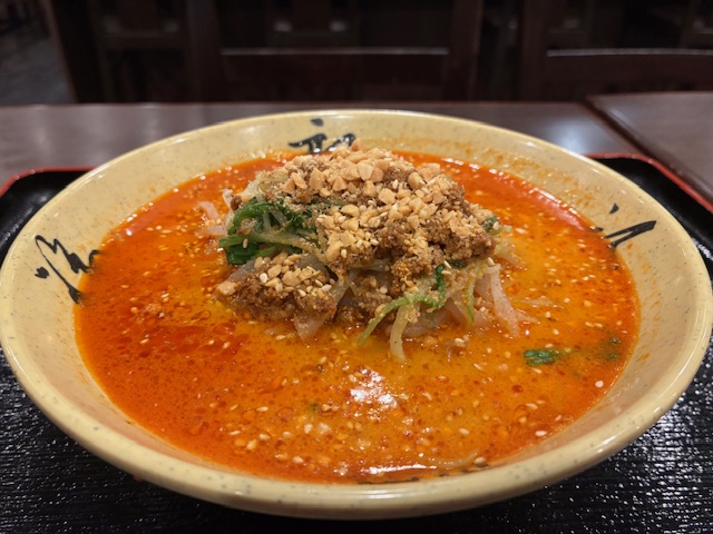 運ばれてきた瞬間、山椒と辣油の香りが食欲をフルスロットルに! 真っ赤なスープは、ゴマの濃厚なコクやしっかり味の挽肉に香ばしいナッツがかかってて程よい辛さでとろりとしており麺とよく絡みます☆彡